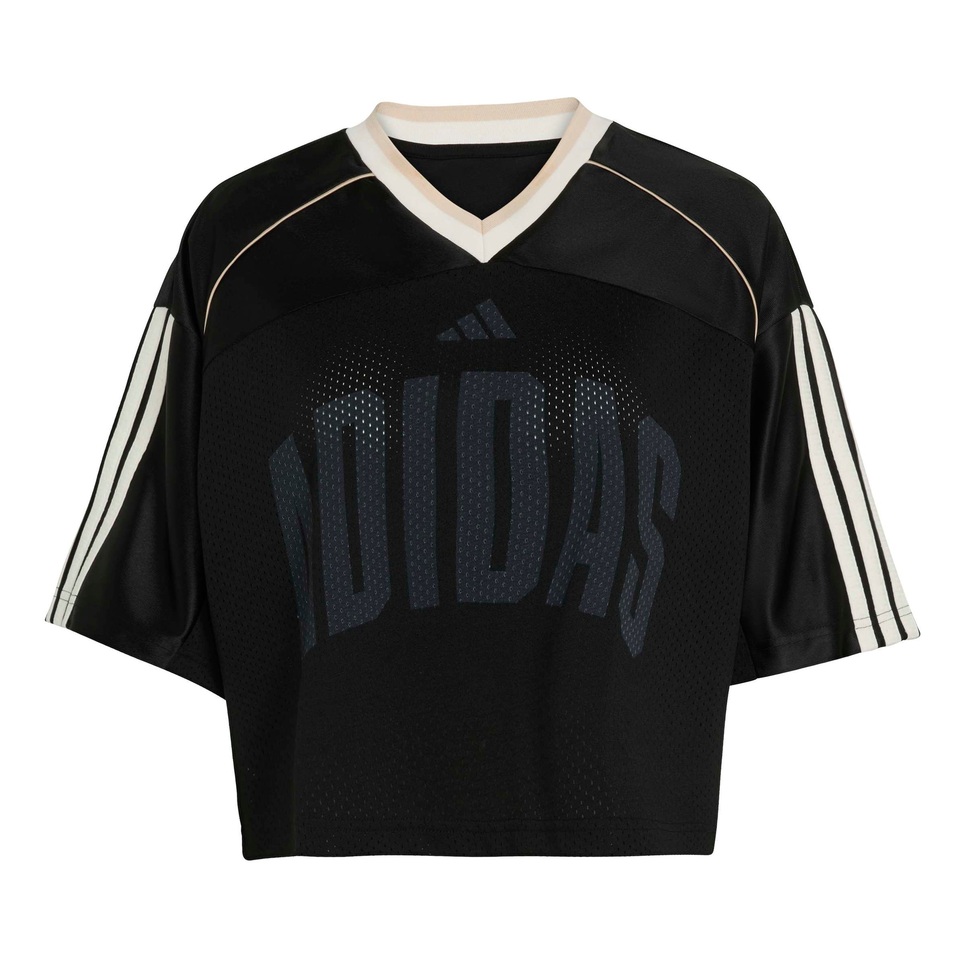 With its loose fit and slightly cropped design, it offers a relaxed silhouette that works well for casual outings. The V-neck and ribbed collar add a touch of classic style, while the tricot panel on the shoulder enhances the sporty appeal.